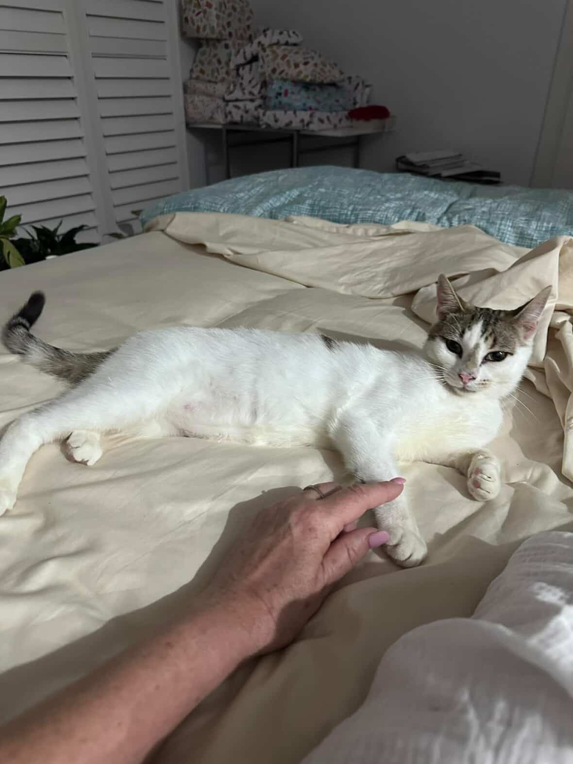 Angel is a very special one-year-old boy with a heart as warm as his story. He came from an outdoor colony, and despite a rougher start to life, he quickly proved himself to be one of the friendliest and most affectionate cats in the group. From the moment he was rescued, it was clear that all Angel wanted was love, comfort, and a human to call his own.