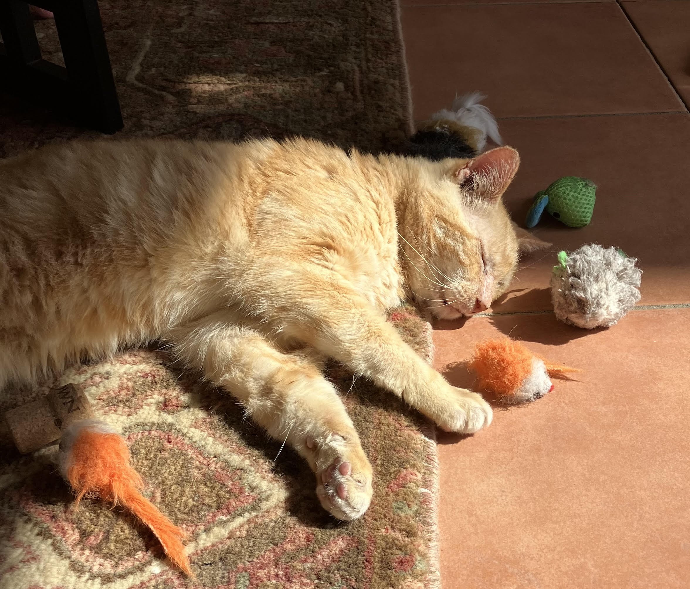 In exchange, if you adopt Aslan he’ll be your bestie,Ā devoted, gently affectionate and very entertaining.Ā He runs, jumps and does all the normal things other cats do and he loves chasing ping-pong balls down the stairs, batting feathers on a stick and soaking up sunny spots around the house. He is calm, affectionate, unique, clever, and full of character.