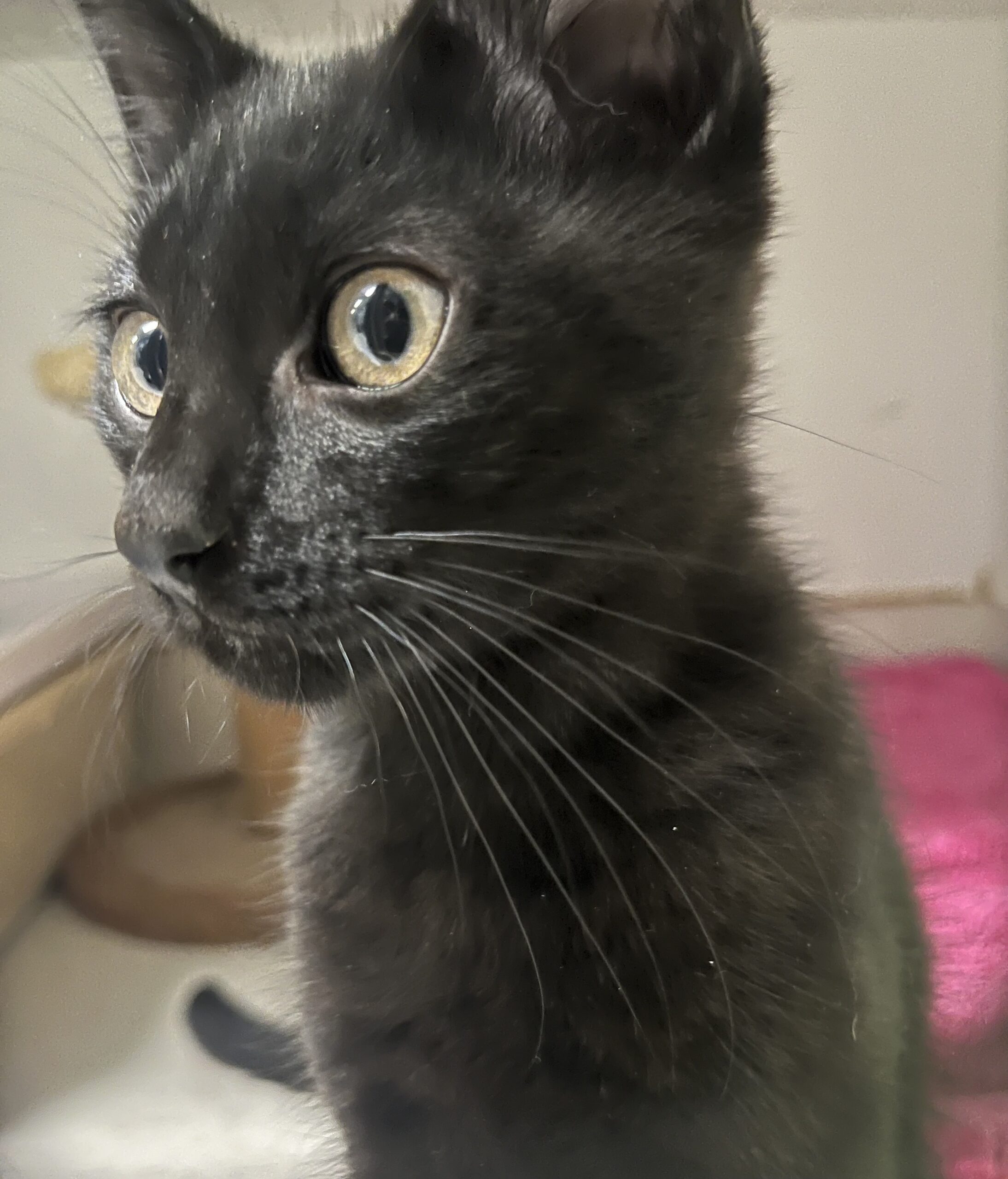 Meet Cutie, a charming 3-month-old black kitten full of energy and affection! He grew up in a foster home with a young child (who named him), so he’s used to gentle handling and enjoys being around people. Cutie is incredibly playful and curious, always ready to chase a toy or explore his surroundings—he’s sure to keep you entertained!