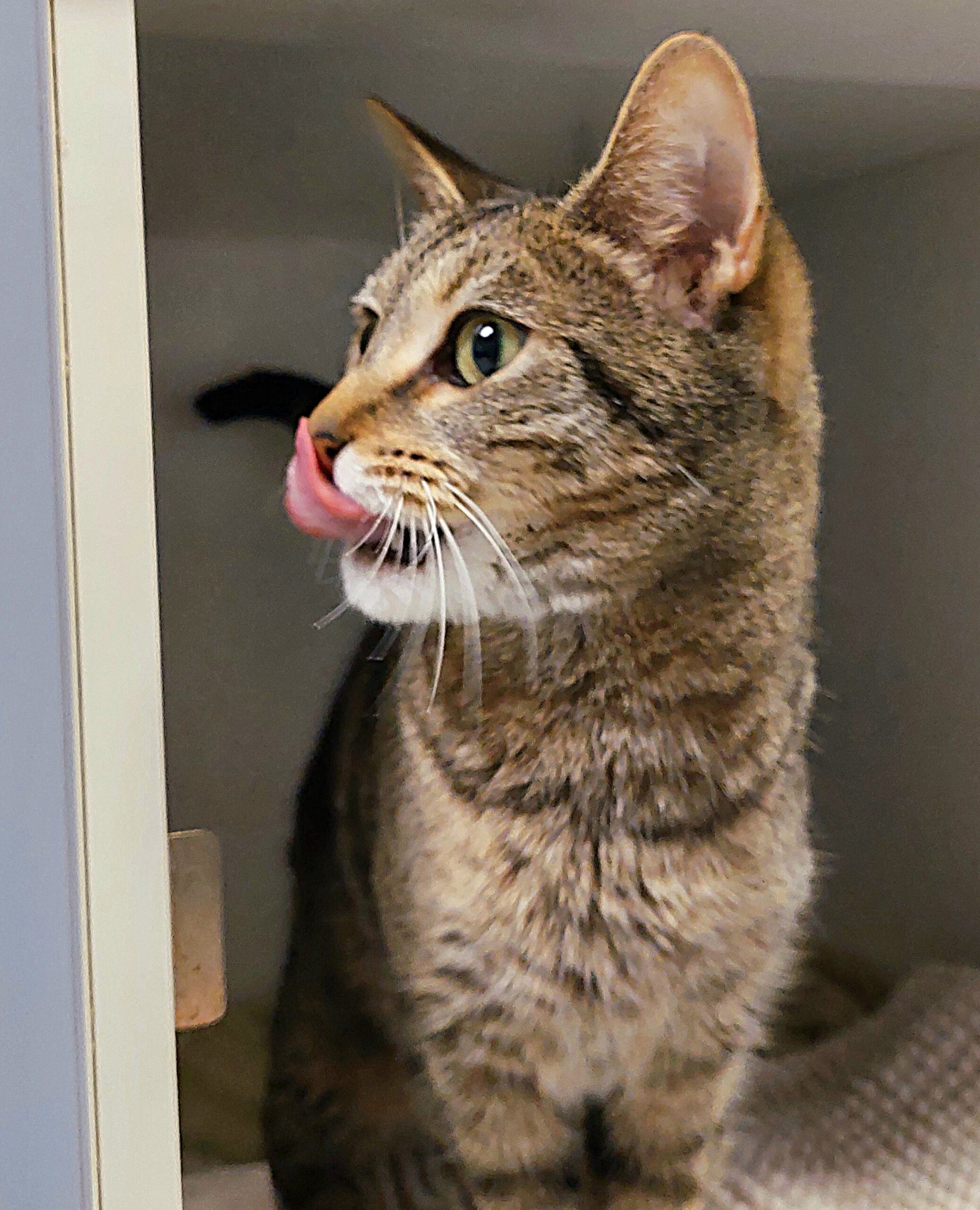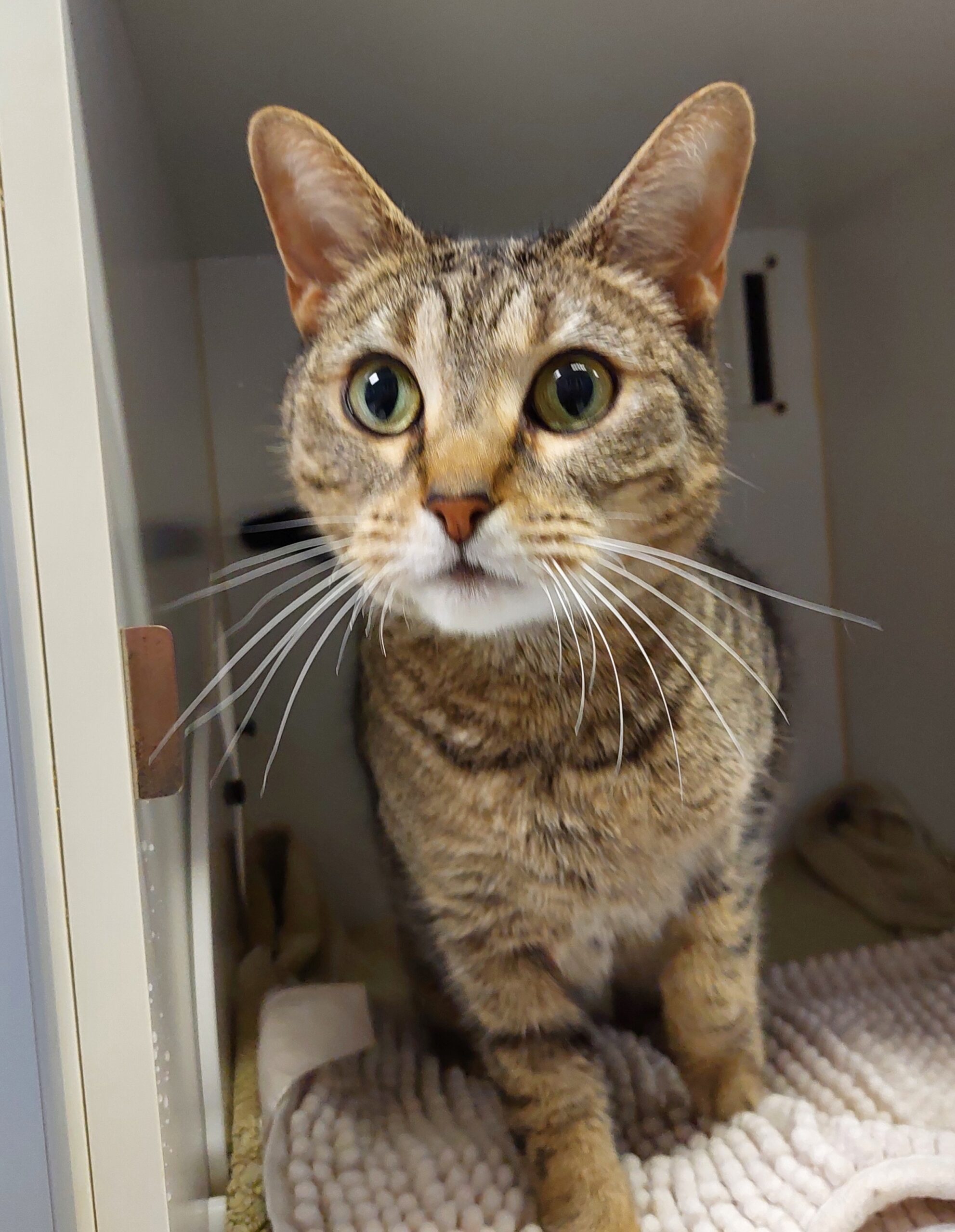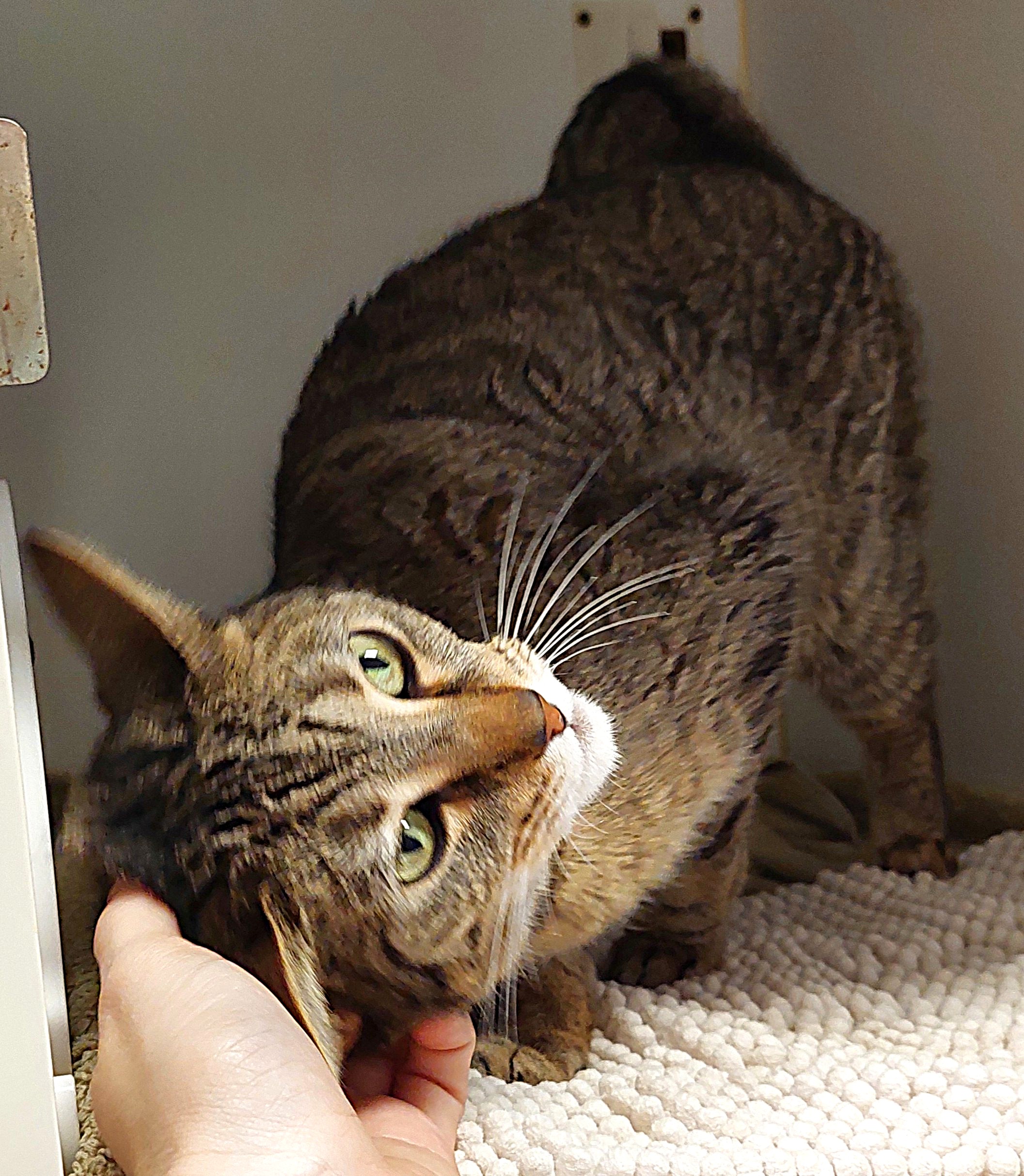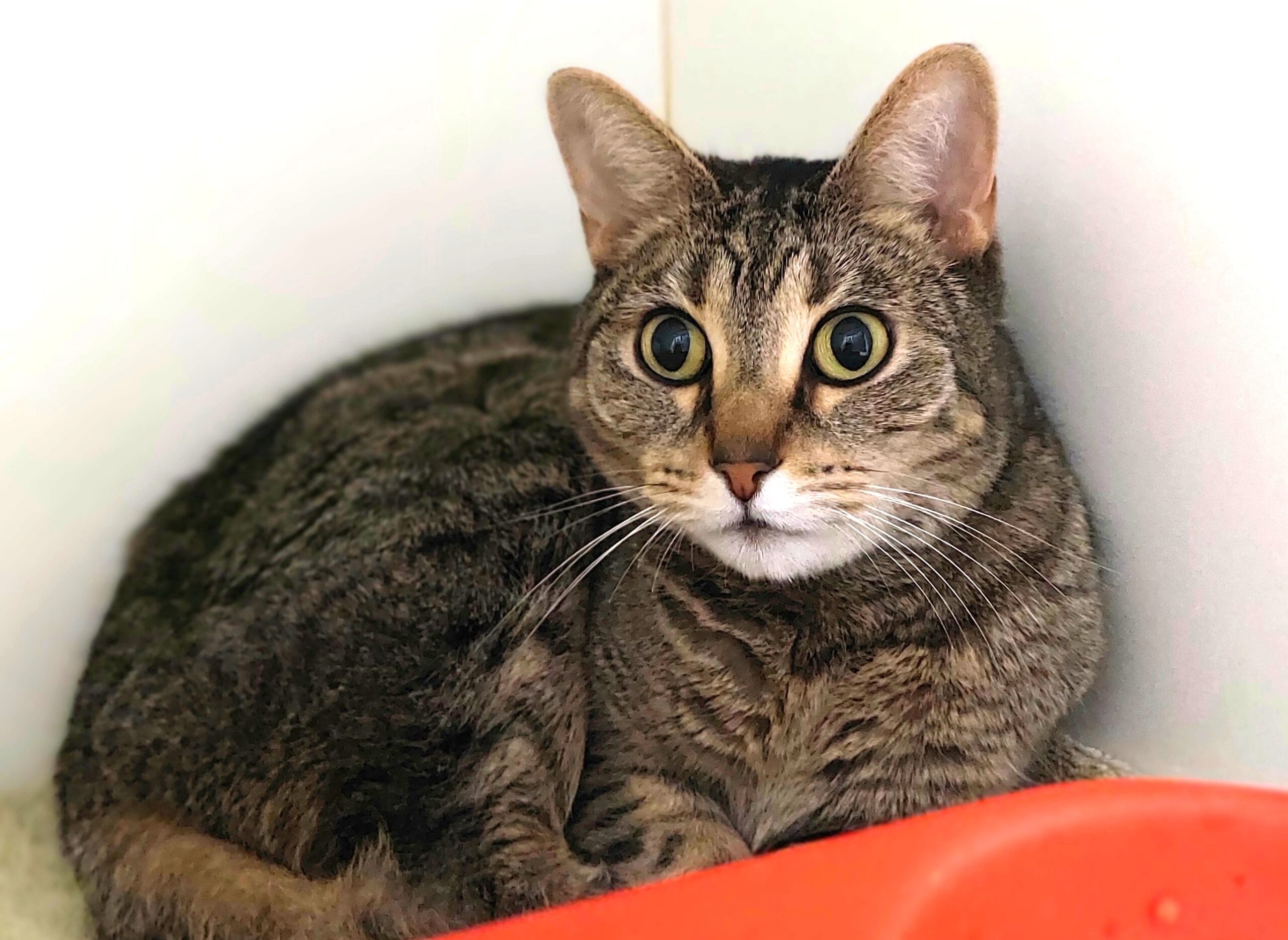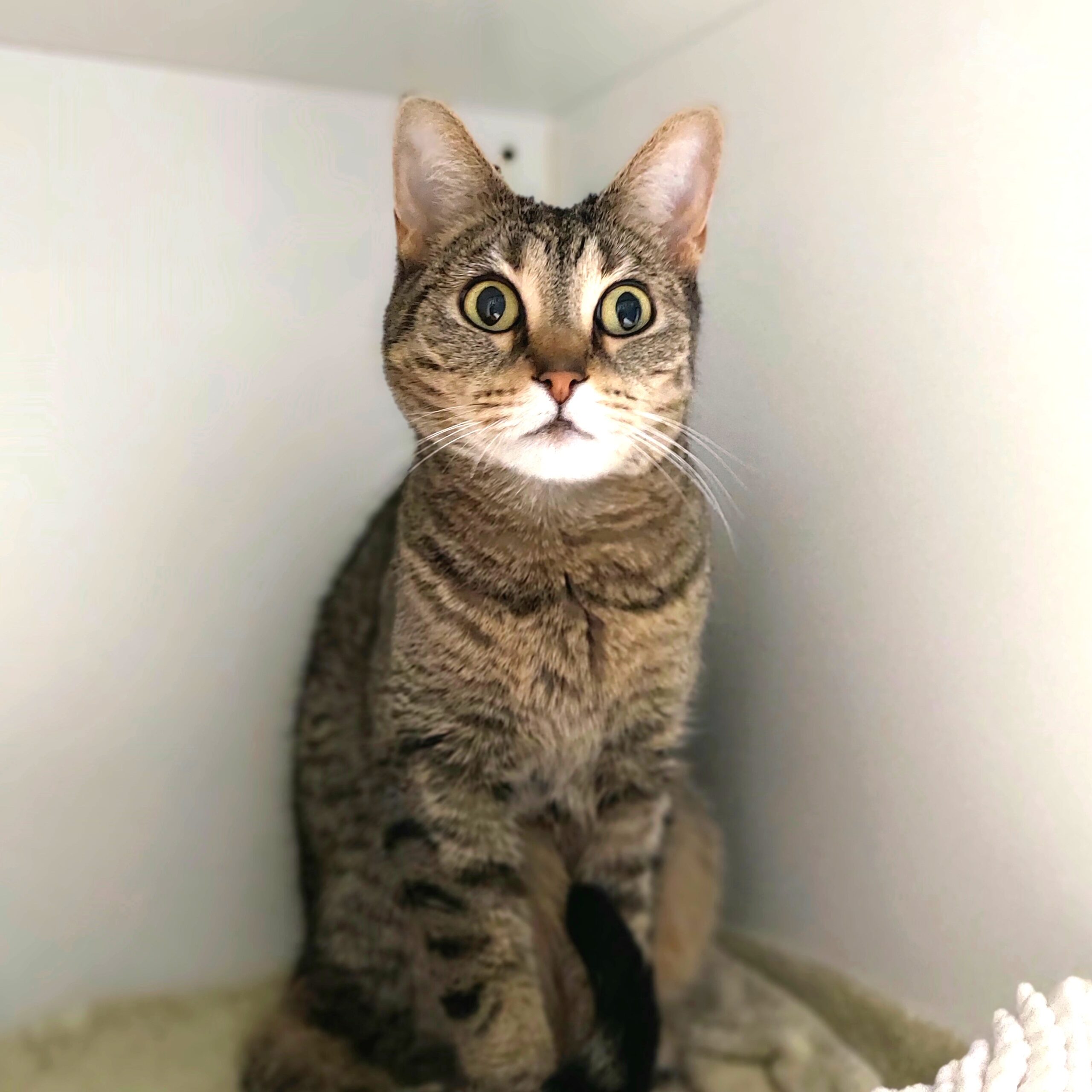 Goldie is a beautiful tabby with striking markings and a permanently surprised expression that only adds to her charm. With her wide, round eyes, she always looks a little startled – but don’t let that fool you. Beneath her cautious exterior is a sweet, responsive girl who just wants to be loved.