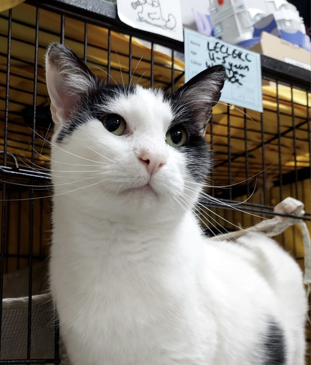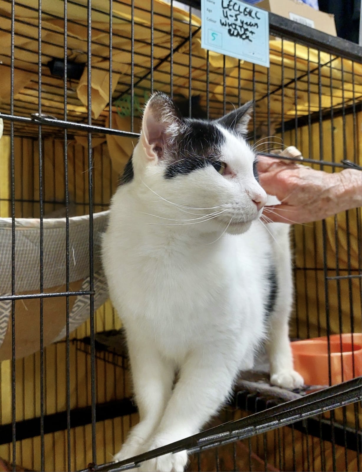 Meet Leclerc, a striking black-and-white 5-year-old cat with a playful spirit. He loves to run, chase, and engage in a bit of rough-and-tumble fun, especially with other cats. In the shelter, he’s shown he can enjoy the company of both adult cats and kittens, both out on the floor and playing through the enclosure wires with curiosity and enthusiasm. With a proper introduction, he could do well with feline companions in a home setting.
