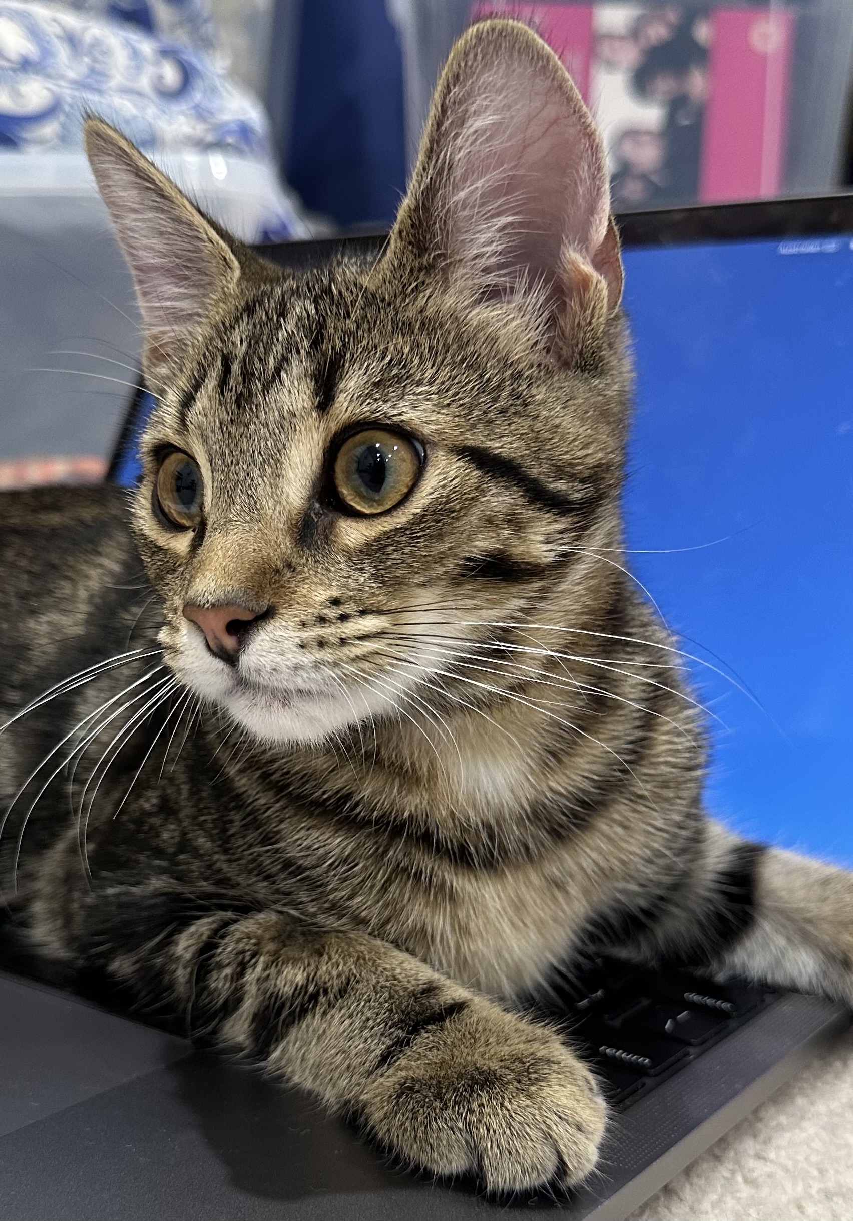 She grew up in a loving foster home with her sister and eight other cats, and she absolutely thrives in feline company. Curious, adventurous, and full of energy, Minette loves exploring and playing with the resident cats. When playtime winds down, she’s also happy to curl up for a cuddle.
