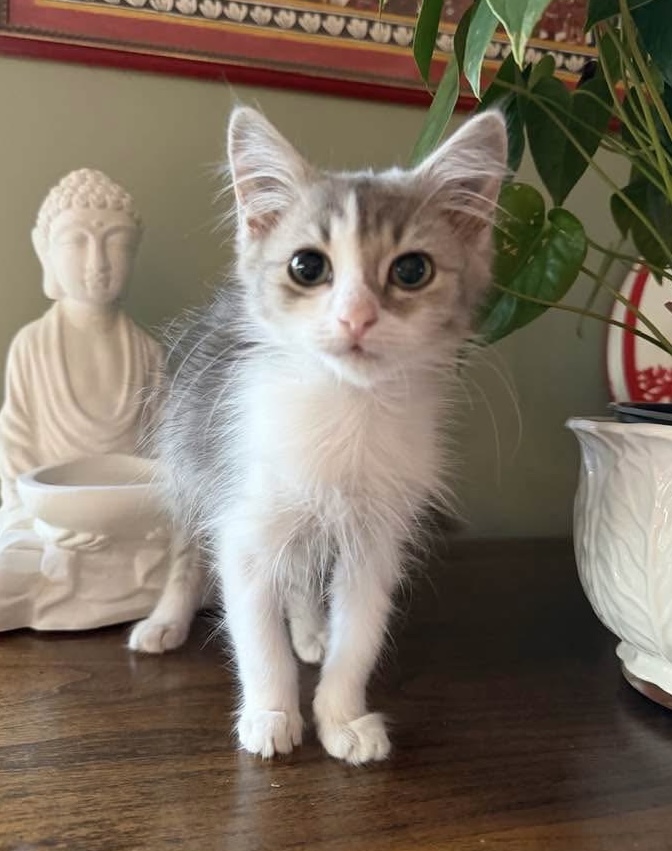 Pebbles is a 4.5-month-old fluffy grey-and-white kitten looking for her forever home. She arrived with her mum and siblings and is now the last of the litter still waiting to be adopted.