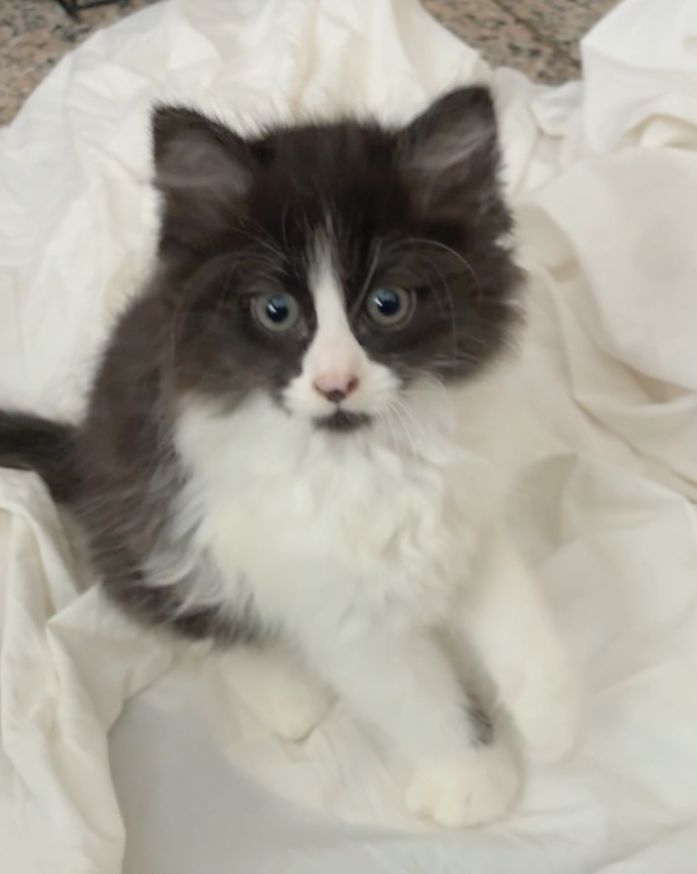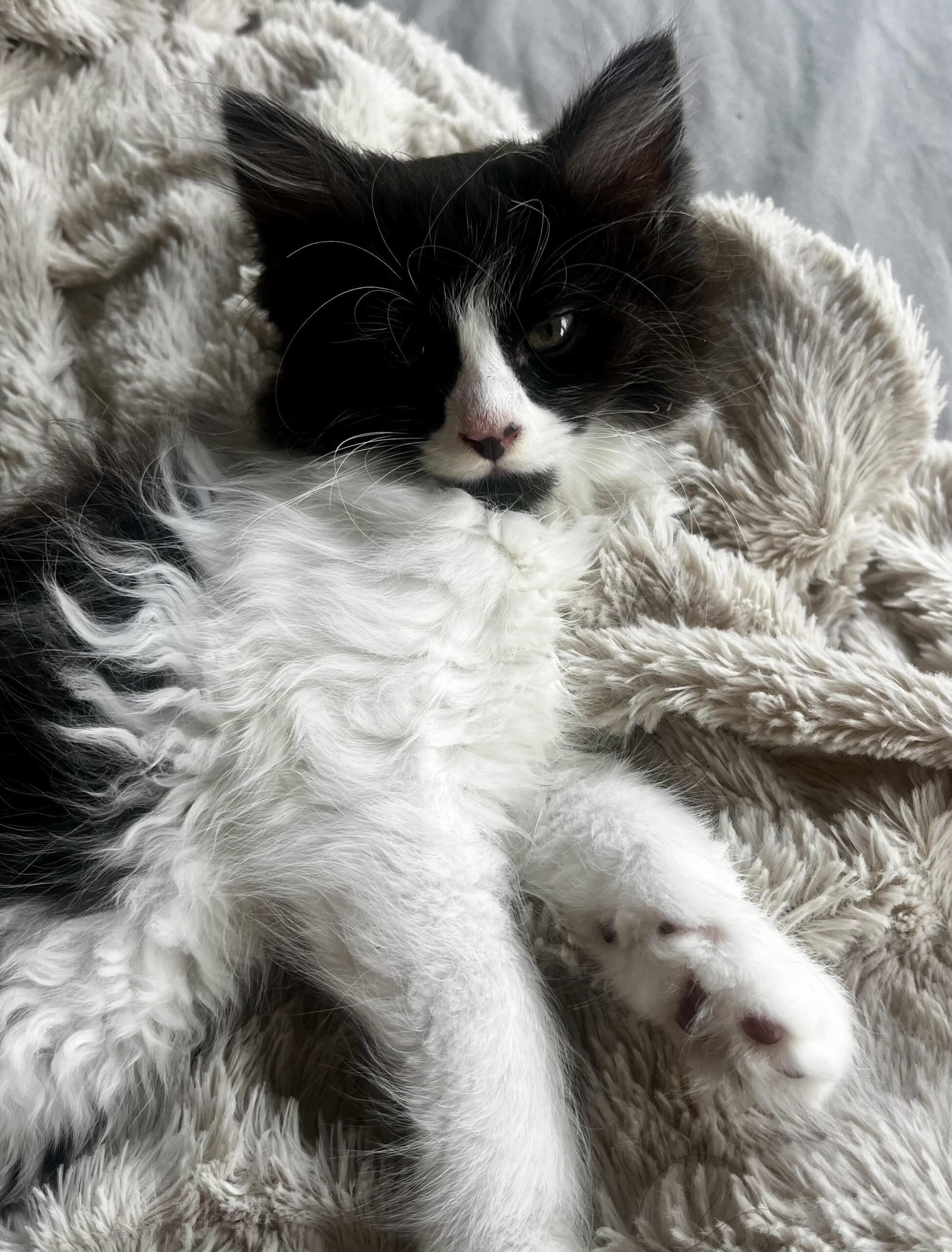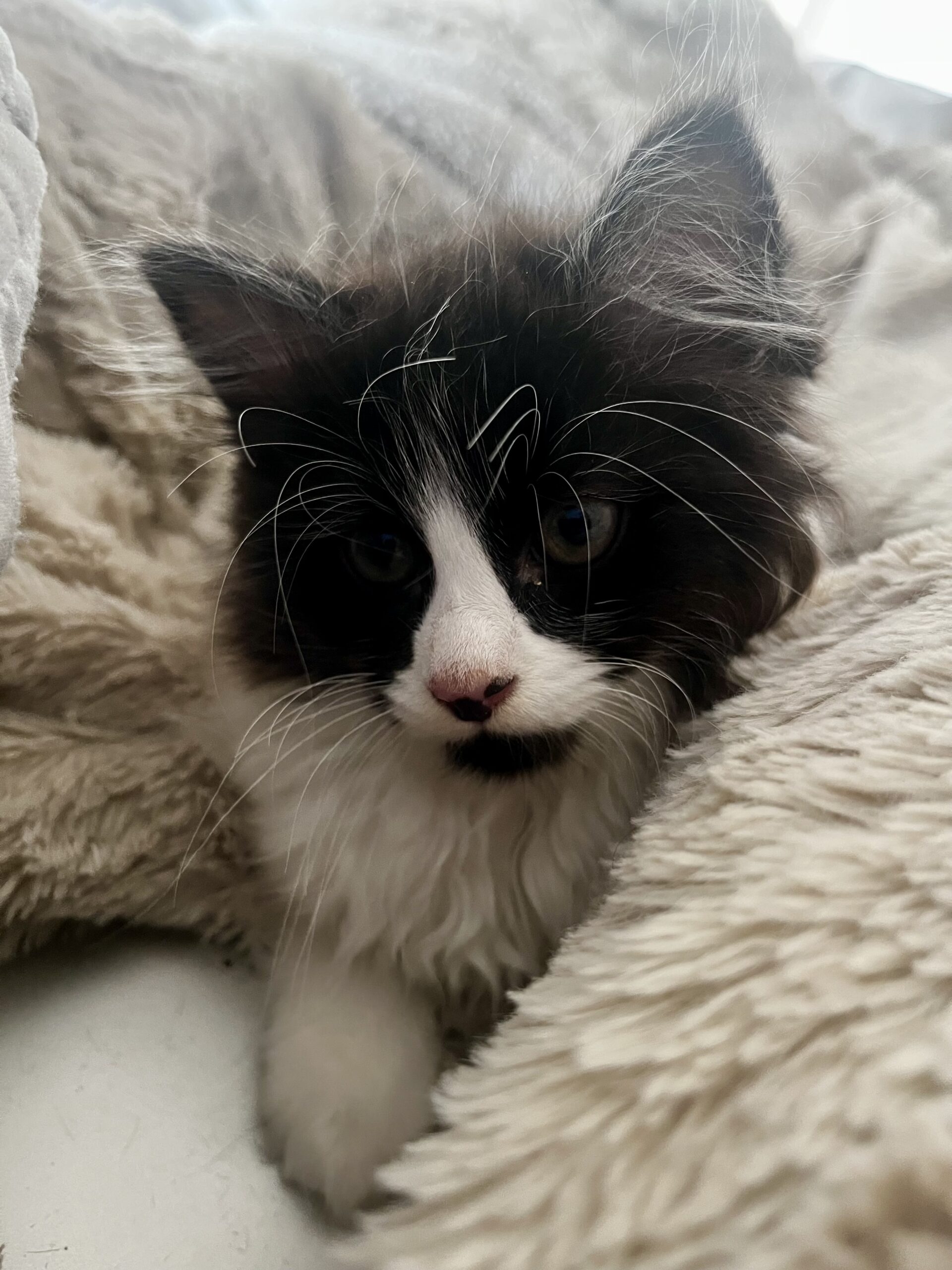Sherlock is a 3-month-old fluffy tuxedo kitten who came into care with his siblings three weeks ago. From the very beginning, he has stood out as the most confident of the litter.