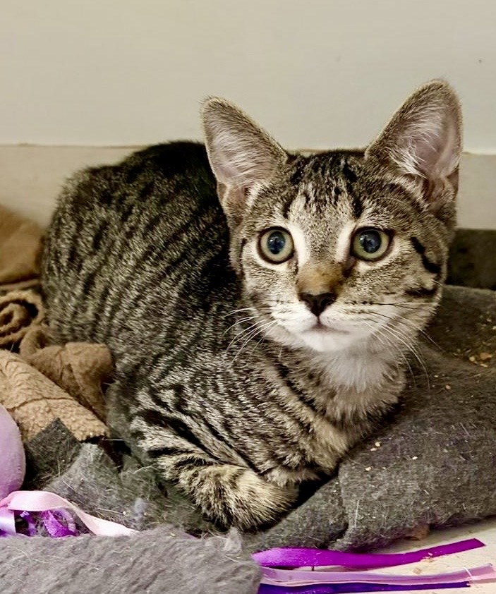 Sybie is a 4-month-old tabby kitten with a beautiful nature to match her looks. She is the only surviving kitten from her litter; her biological mum was unable to engage much with her kittens, but thankfully another mother cat stepped in and raised Sybie alongside her own kitten. Growing up with her foster mum and step-brother has helped Sybie develop into a wonderfully social, confident little girl.